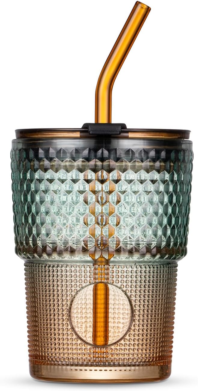 13 oz Tumbler Water Glass, Water Bottle with Straw and Dustproof Lid, Coffee Ice Cup Double Wall Insulated Glass Cup (Amber-Ribbed)