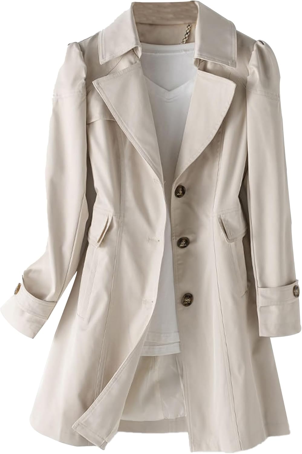 SOMTHRON Women's Single Breasted Mid-Length Trench Coat Puff Sleeve Lapel Overcoat Windproof Classic Outerwear