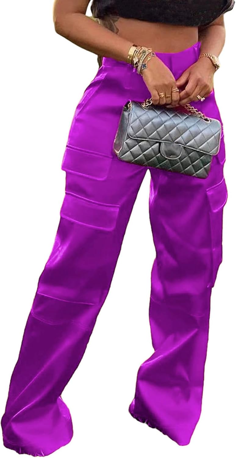 XZLUFNY Satin Cargo Pants for Women High Waist Multiple Pockets Wide Leg Trouser