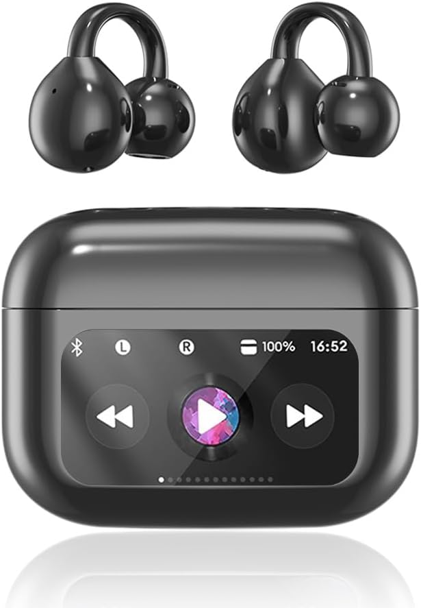 Clip On Ear Headphones, Open Ear Earbuds Wireless Bluetooth 5.4, Clip On Earbuds with LCD Touchscreen, Lightweight Comfort Open Ear Headphones for Pad Tablet Laptop Android/iOS Phones (Black)