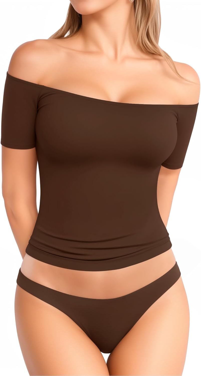 MANGOPOP Off The Shoulder Tops for Women Sexy Short Sleeve T Shirt Tops Slim Fitted