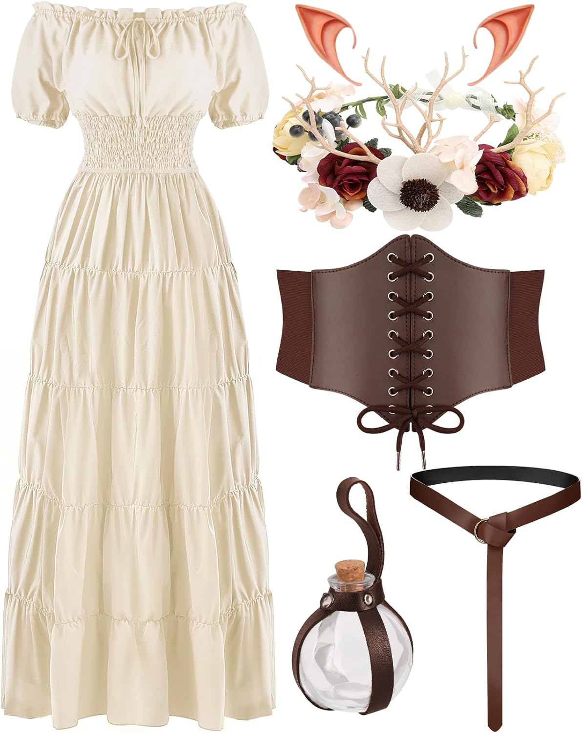 Renaissance Costume Women Medieval Fairy Dress, Corset Elf Ears Garland Belt Potion Bottles Peasant Halloween