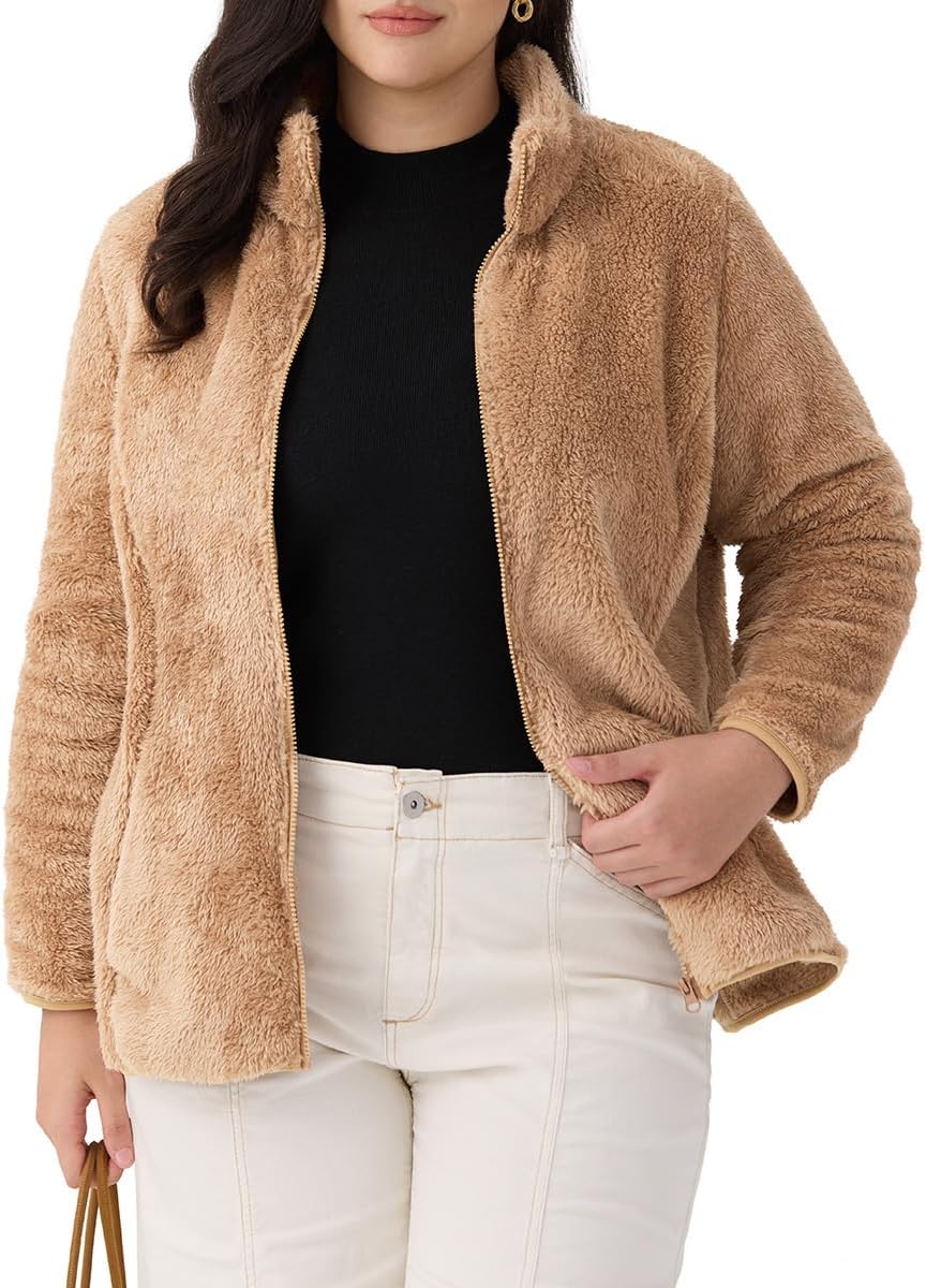 CARCOS Plus Size Fuzzy Jacket for Women Full Zip Up Fleece Coat Long Sleeve Fall Winter Sherpa Outerwear with Pockets