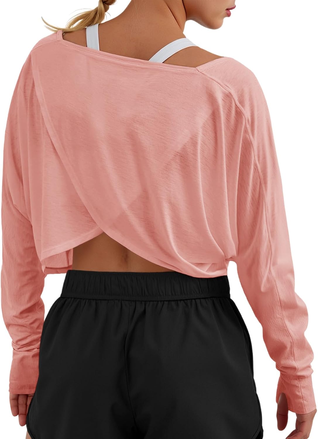 Fisoew Womens Long Sleeve Workout Tops Athletic Shirts Cropped Crossover Back Loose Running Gym Tee with Thumb Holes