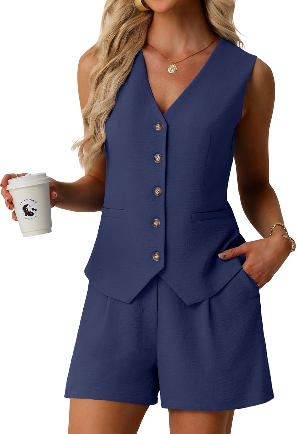 Lepunuo Women's Summer 2 Piece Outfits Sleeveless Button Down V Neck Vest Business Casual Outfits Vacation Travel Sets