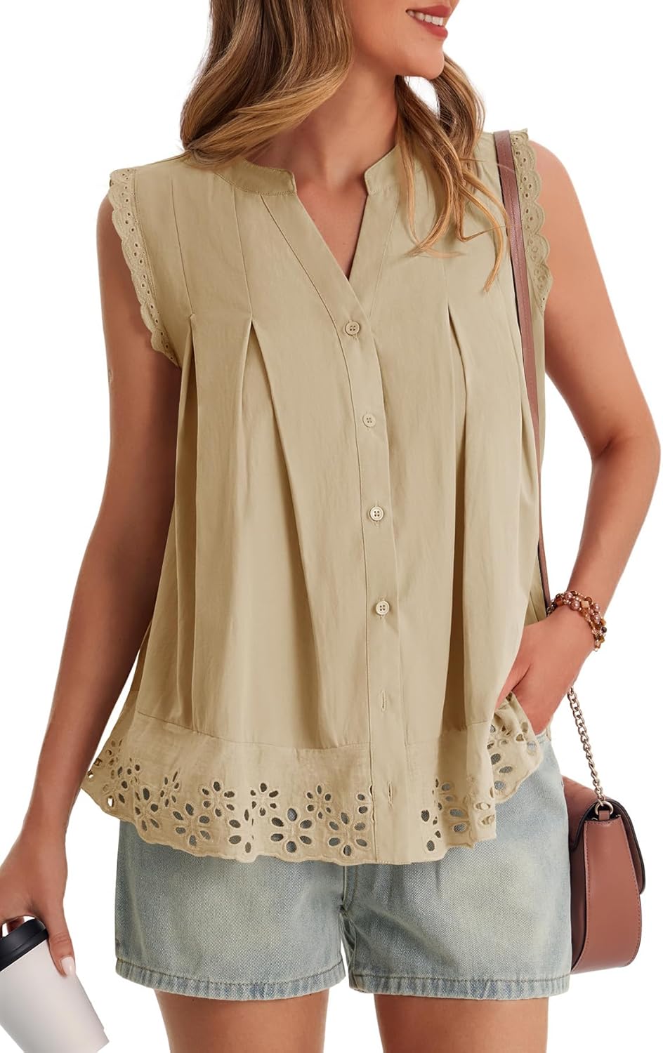 Cicy Bell Womens Summer Eyelet Tank Tops V Neck Ruffle Sleeveless Button Down Shirts Casual Cotton Loose Fit Tees
