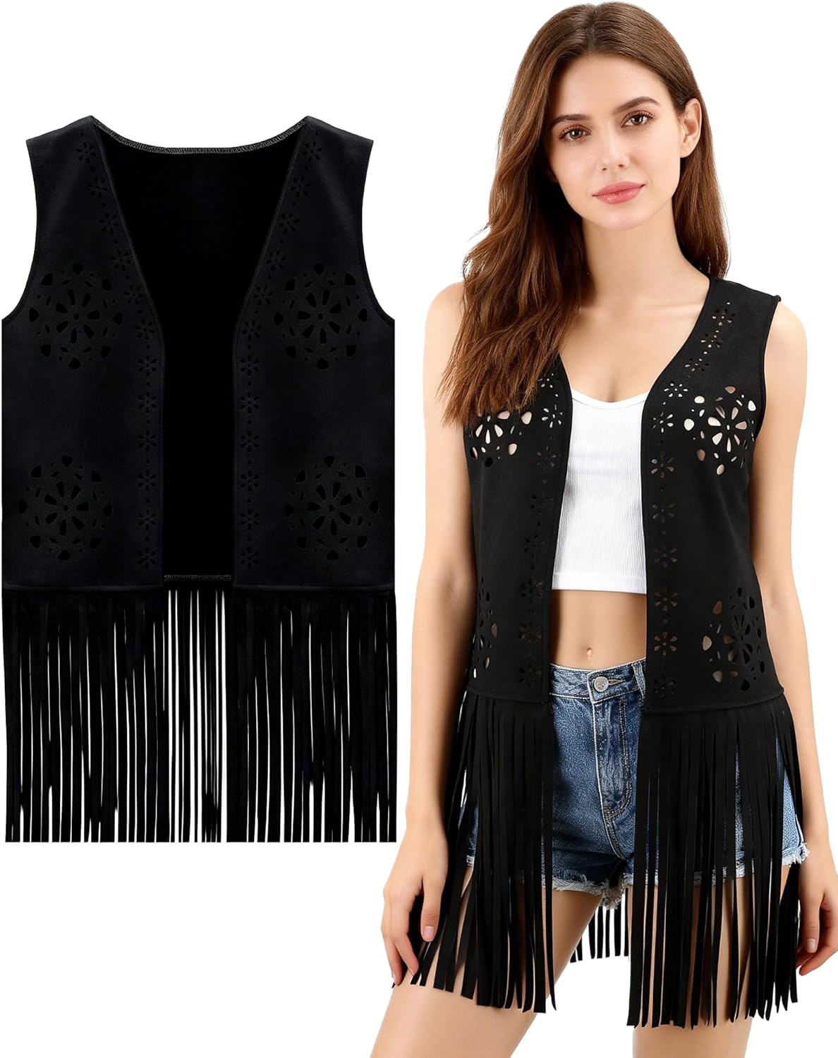Fringe Vest 70s Hippie Costume Women Sleeveless Cowgirl Western Outfits Faux Suede Tassel Vintage Hippie Outwear