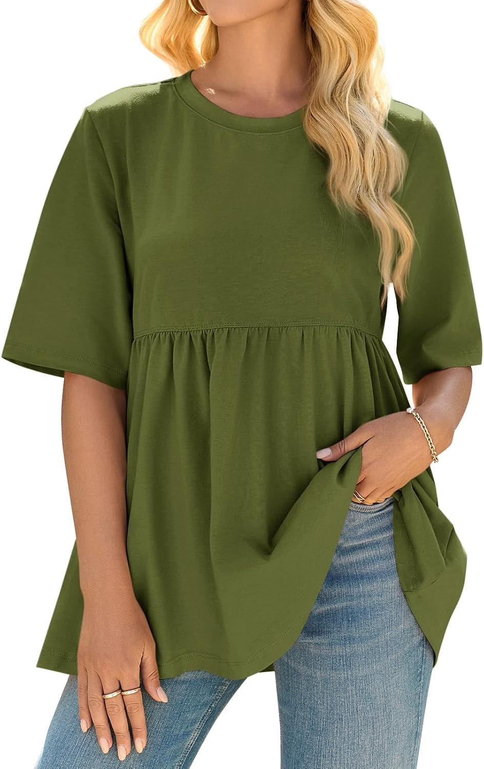 Cicy Bell Womens Summer Babydoll Tops Oversized Short Sleeve Crewneck T Shirts Peplum Casual Loose Blouse