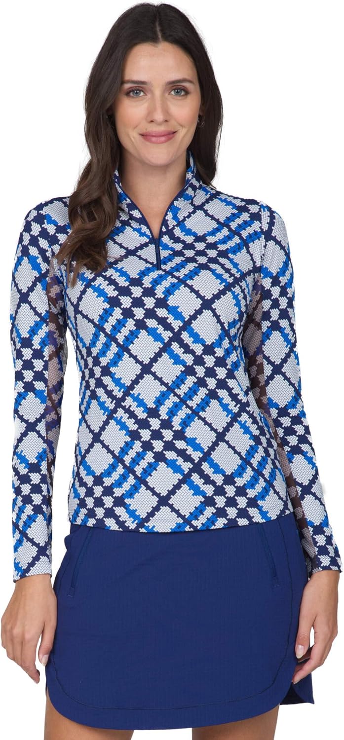 IBKUL Athleisure Wear Sun Protective UPF 50+ Icefil Cooling Tech Sonika Print Long Sleeve Mock Neck Top – 10653 Blue/Navy Sonika XL