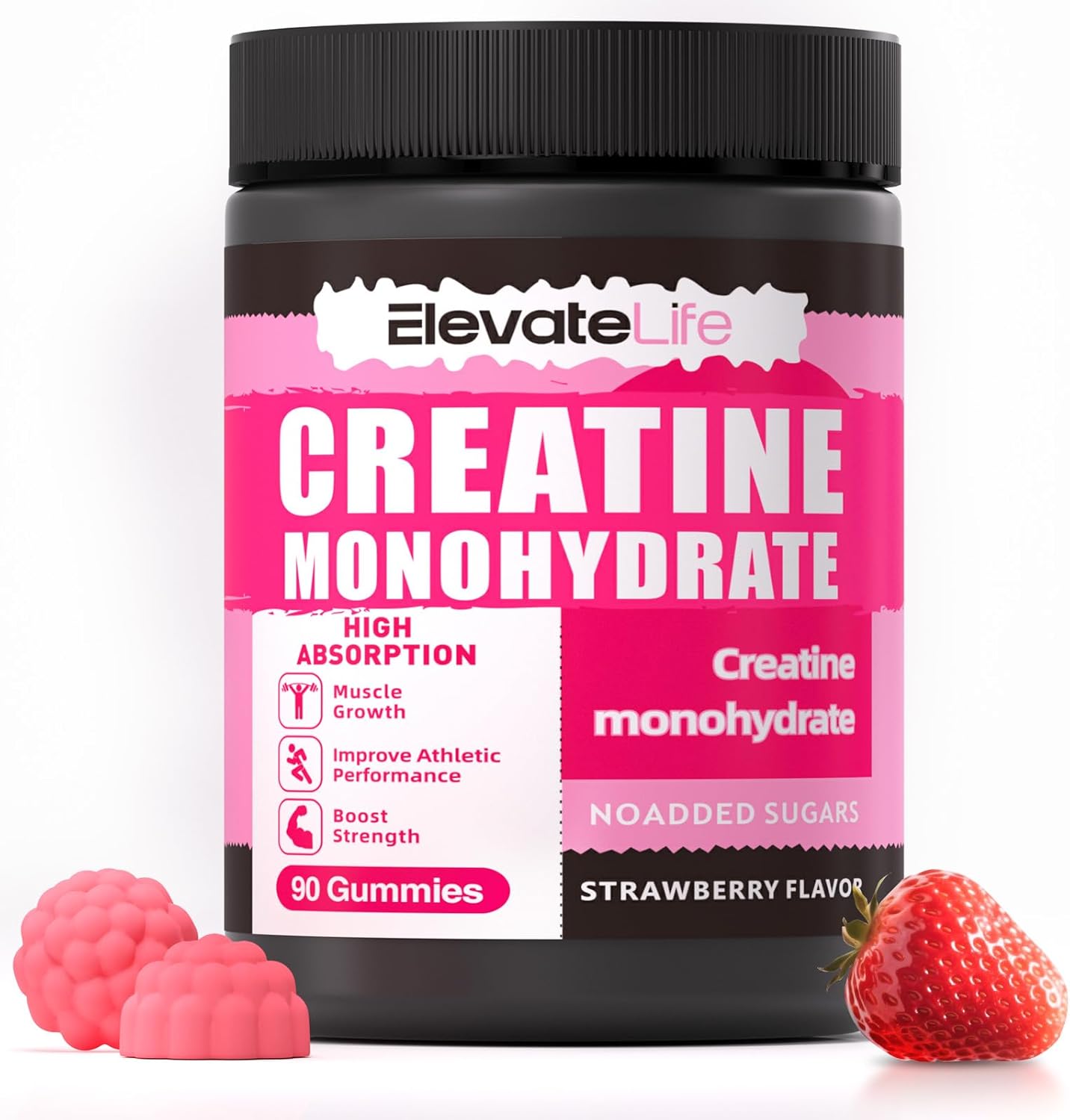 ElevateLife Creatine Monohydrate Gummies 5000mg for Men & Women, Chewables Creatine Monohydrate for Muscle Strength, Muscle Builder, Energy Boost, Pre-Workout Supplement(90 Count)-Strawberries