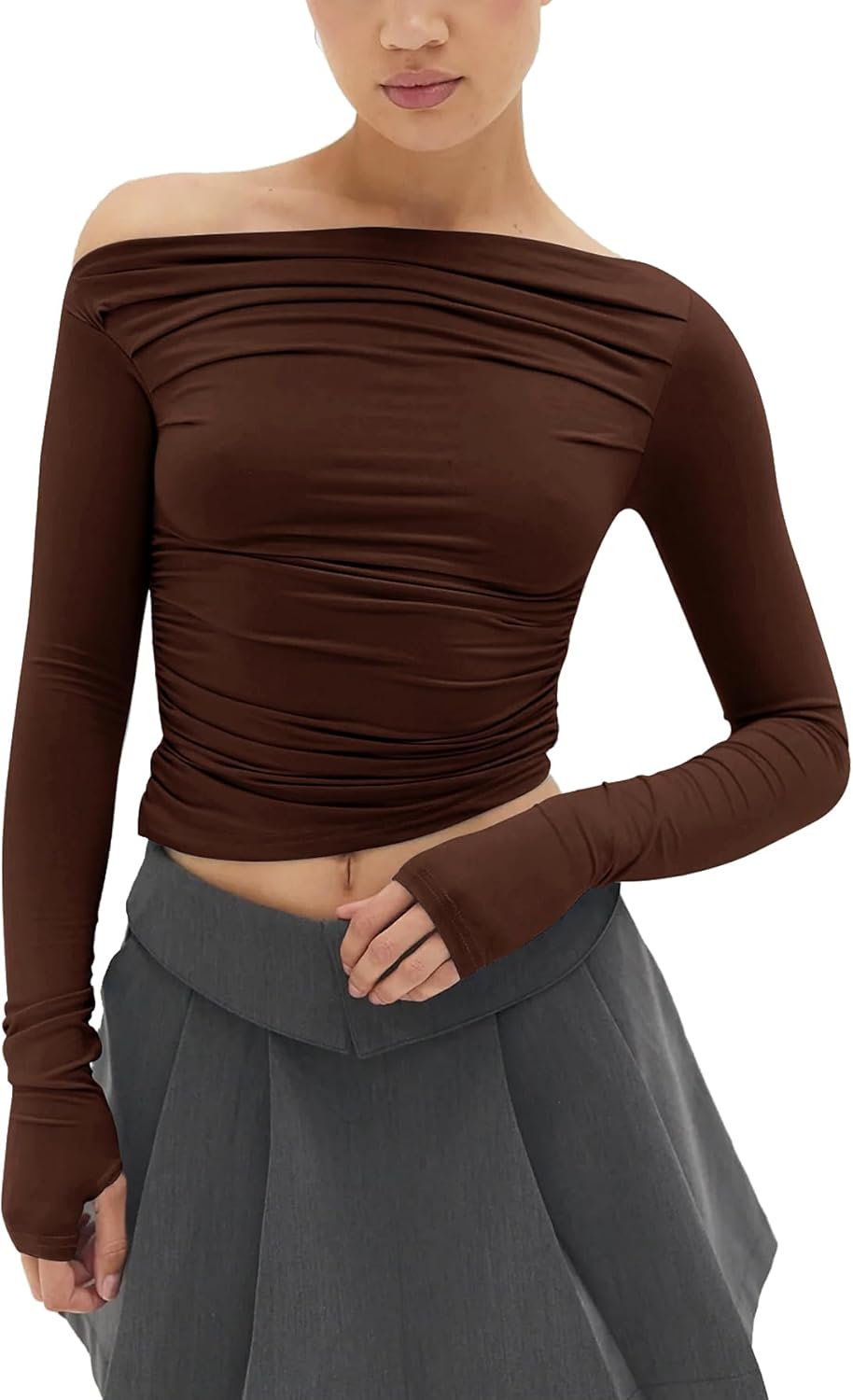 MISS MOLY Women's Off Shoulder Asymmetrical Tops Y2K Ruched Slim Sexy Cropped Long Sleeve Tee Shirts