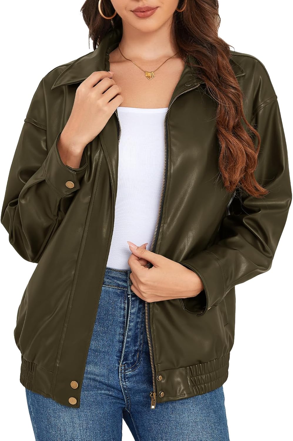 Women's Leather Jacket Faux Zip up Oversized 2025 Fall Motorcycle Outerwear With Pockets
