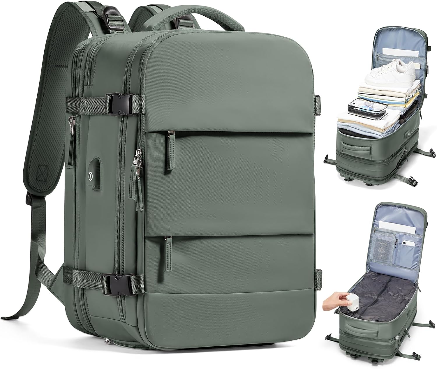 - Flight-Ready Carry-On Size & Dual Compression: Meets US airline personal item/under-seat size (18.5"x12.6"x5.5") & expands to carry-on capacity (18.5"x12.6"x8.66"). Features a vacuum seal backpack system with electric pump to compress clothes in the main compartment, plus an expansion compartment with compression straps