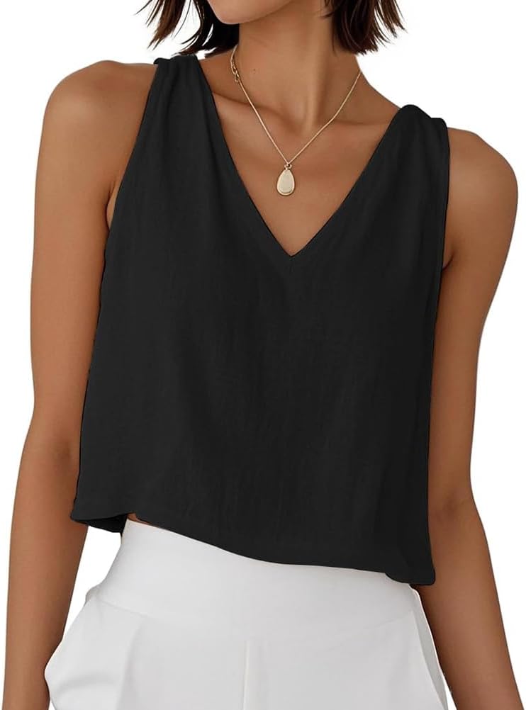 Mywinway Linen Crop Tank Tops for Women Spring Summer Sleeveless V Neck Cropped Casual Fashion Beach Tops Shirts