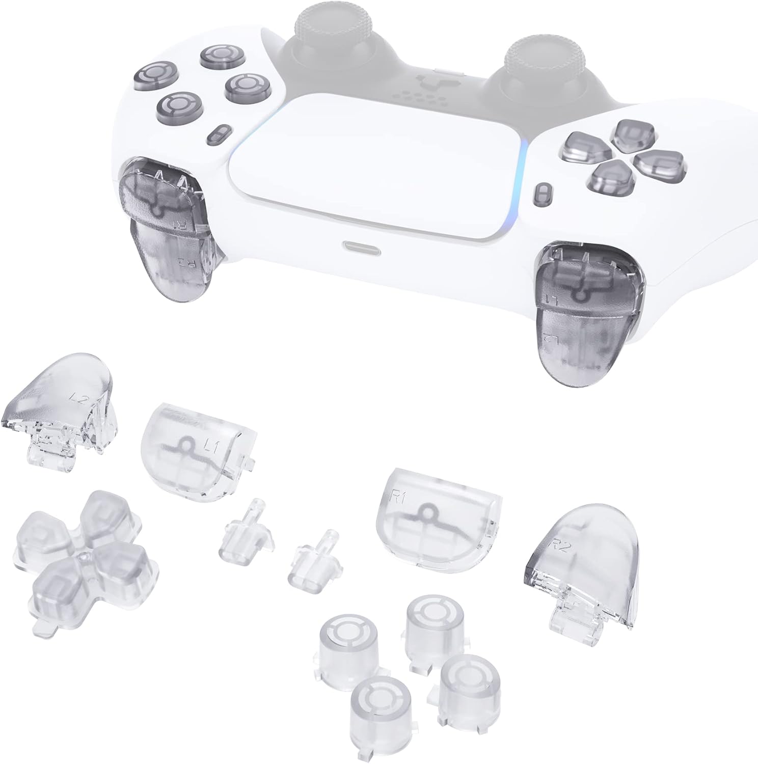 eXtremeRate Replacement D-pad R1 L1 R2 L2 Triggers Share Options Face Buttons, Clear Full Set Buttons Compatible with ps5 Controller BDM-010 & BDM-020