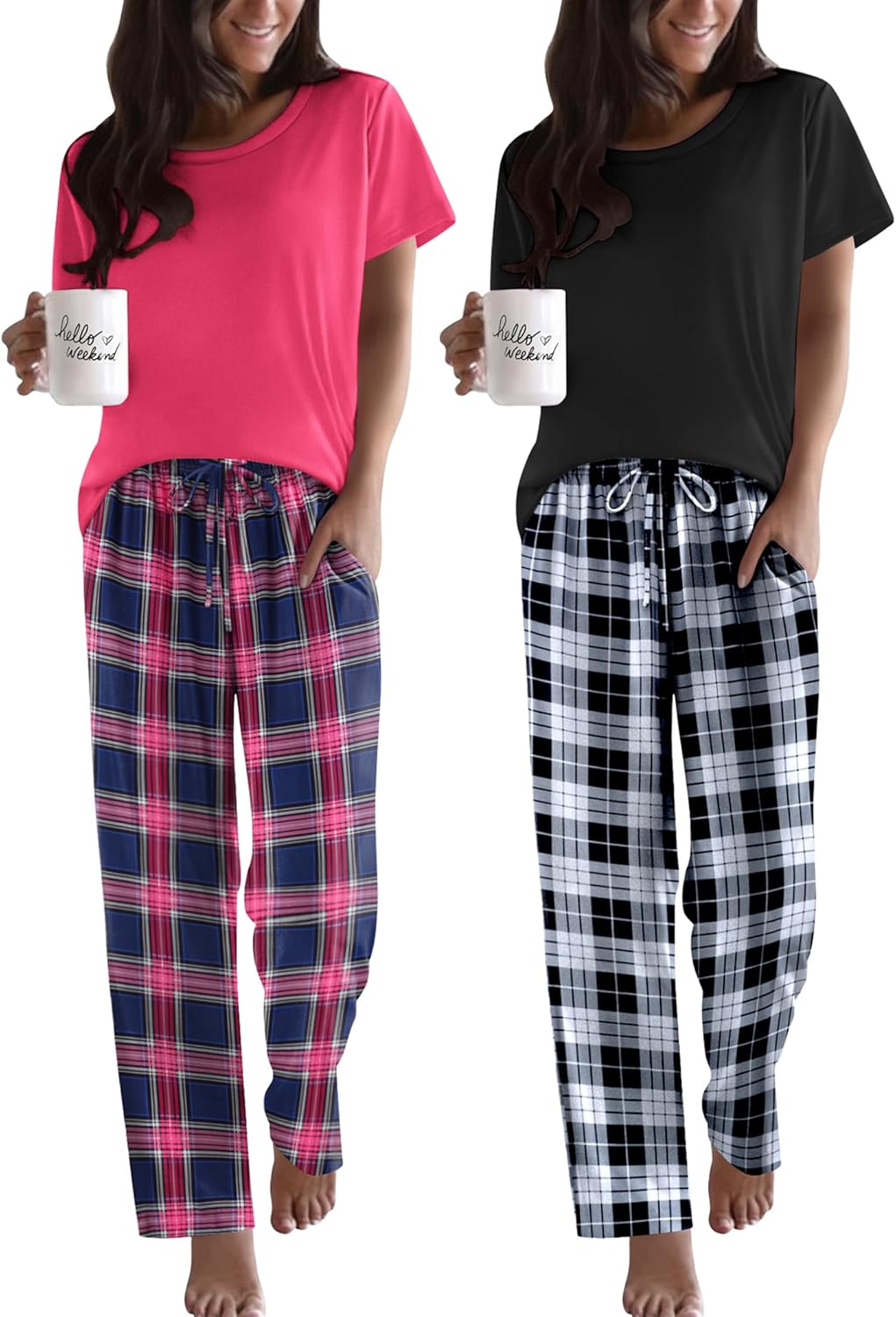 Ekouaer 2 Pack Pajamas for Women Set Short Sleeve Sleepwear Top and Pants Pjs Soft Printed Lounge Sets with Pockets