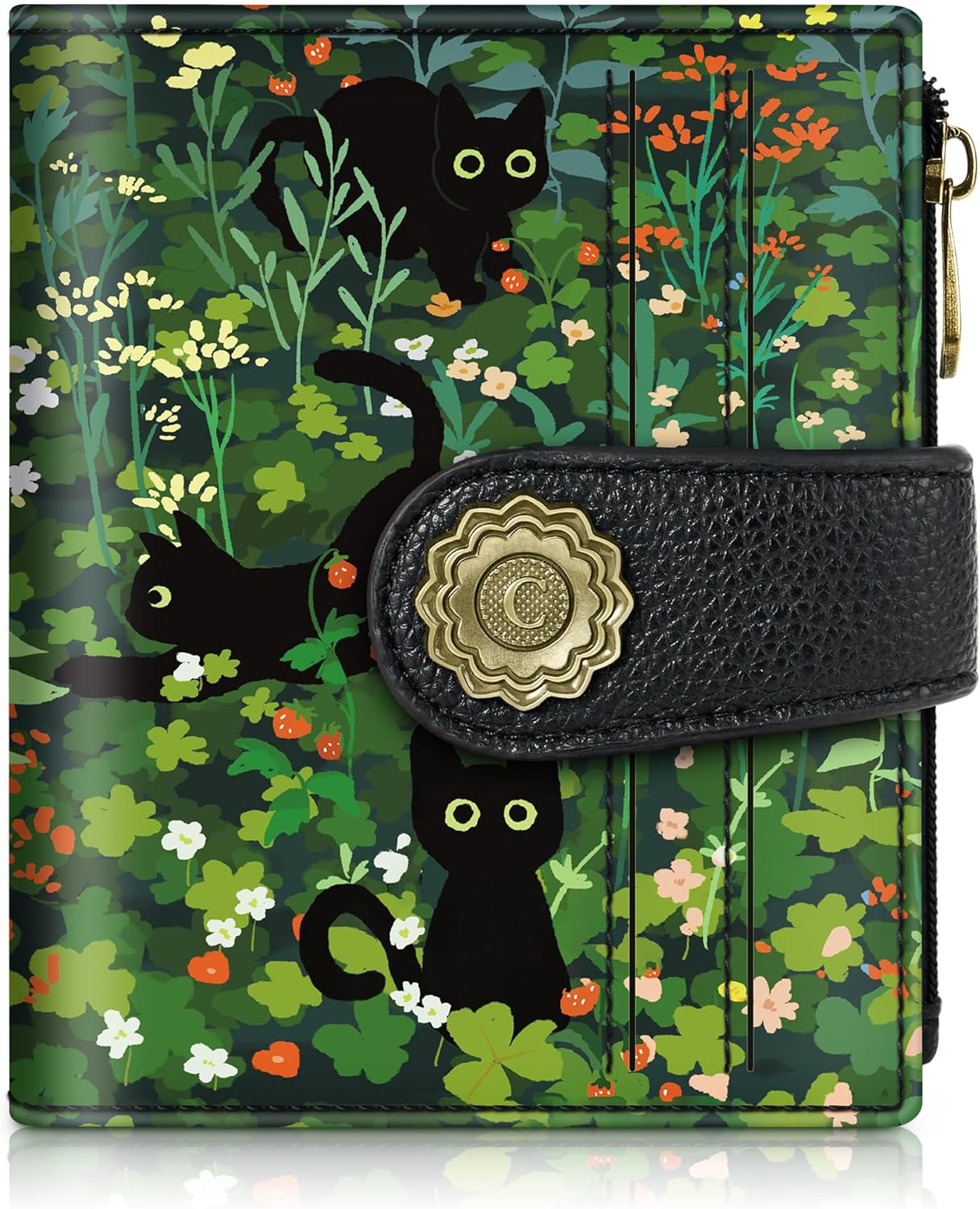 Chelmon Cat Flowers Small Wallet Woman RFID Blocking, PU Leather Bifold Credit Card Ladies Wallets with ID Window, Cute Zipper Coin Pocket Purse for Girls