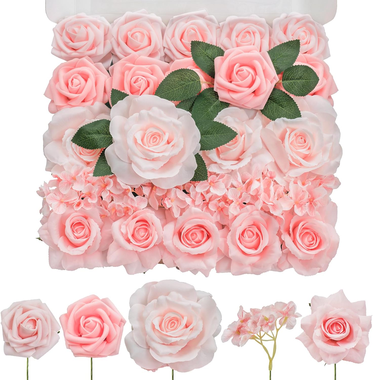 - What You Get: The package includes 5 different colors of rose heads, light pink foam rose ×5 ,deep pink foam rose ×5, light pink rose ×4, pink hydrangea ×7, pink rose ×5, a total of 26pcs faux flowers with 6pcs rose leaves. Each foam rose head is approx. 3.5 inches and the stem is about 8 inches long.