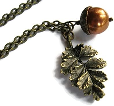 Personalized Acorn Necklace, Designer Faux Pearl Necklace, Antiqued Bronze Leaf Branch Jewelry, Autumn