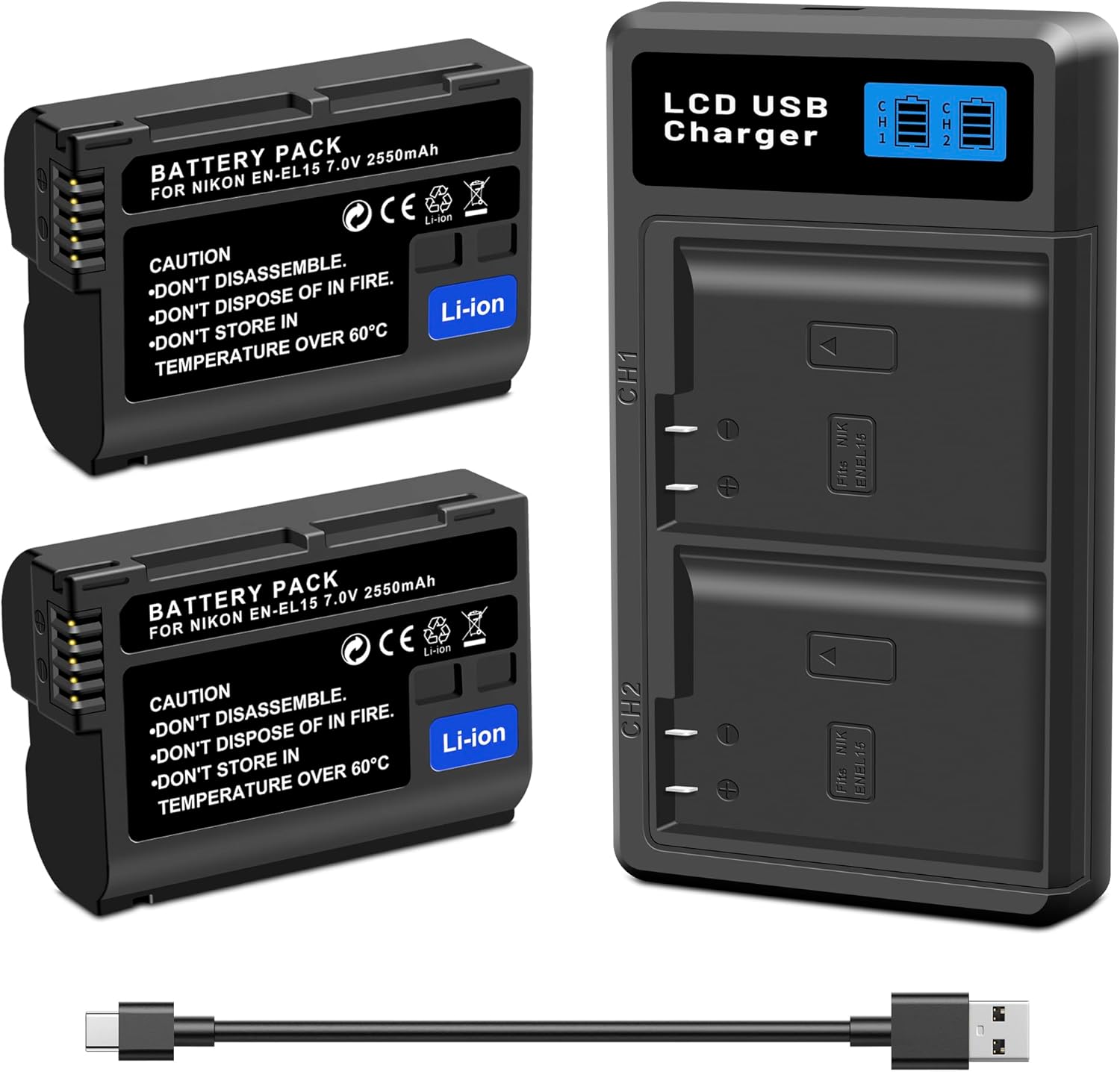 - 【Battery Specifications】Battery Model: EN-EL15 EL15a EL15b EL15c Battery is designed with the upgrade capacity 2550mAh, High capacity and quality cells batteries Can Prolong battery life. We recommend charging battery with our charger, when charging the battery inside the camera, use a power cable/adapter that provides at least 5V 3A. A regular 5V USB cable doesn't have enough voltage for charging.