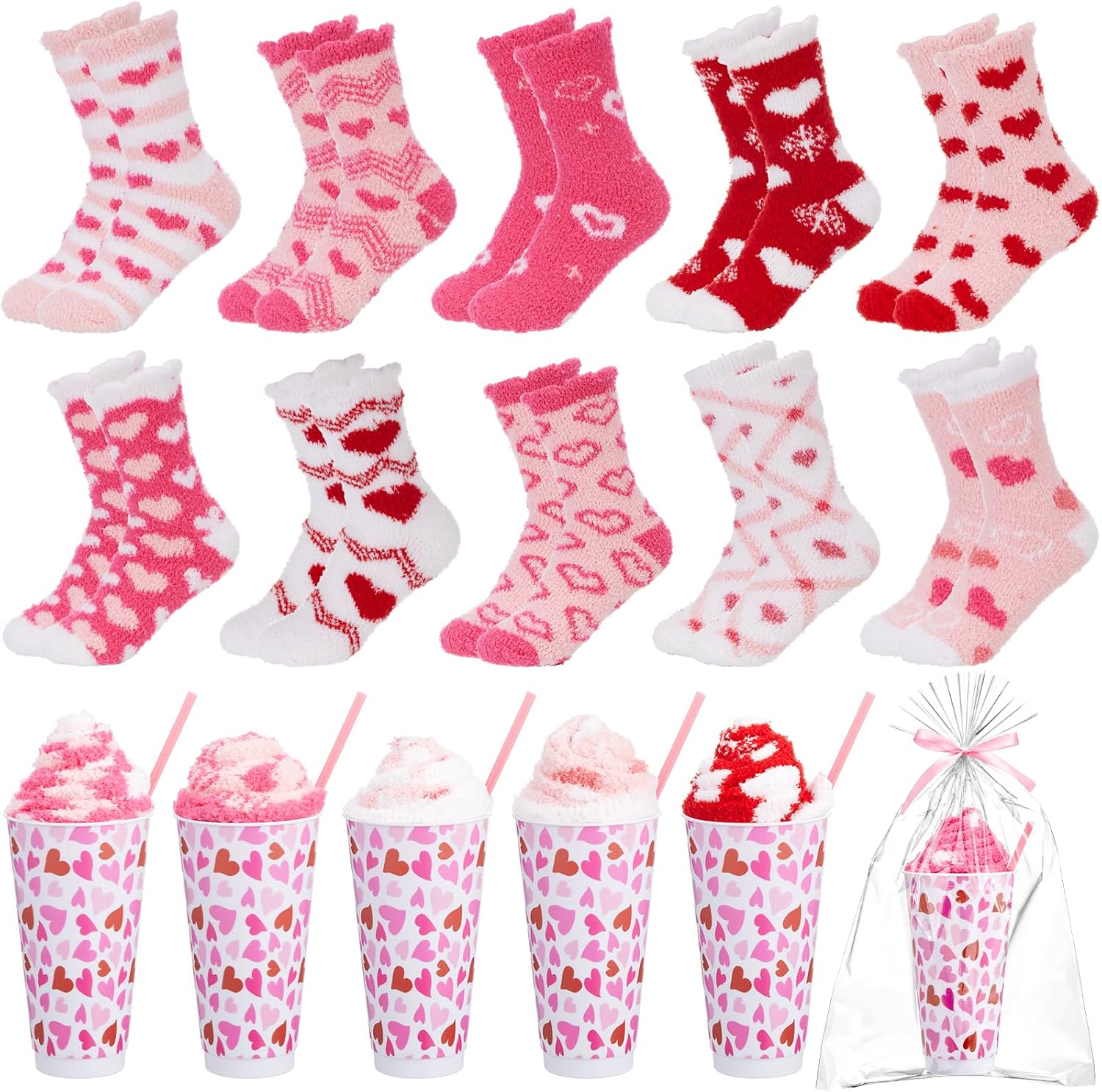 Funtery Galentine's Day Fuzzy Socks Gifts for Women Bulk Valentine Party Stuffers Pink Heart Cup Sock Gift