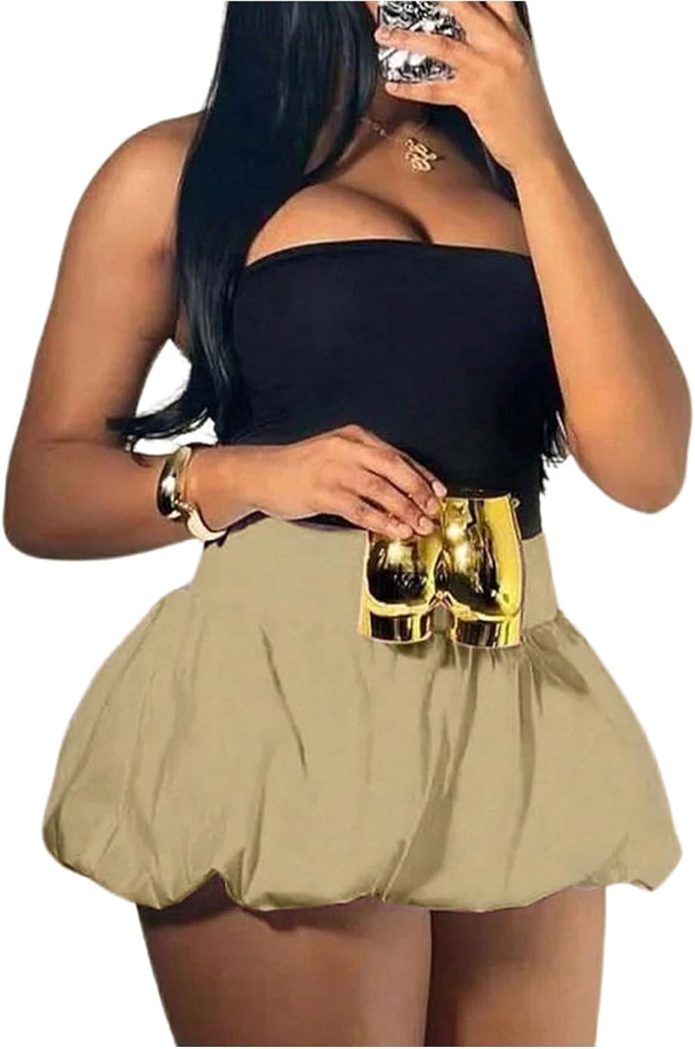 GORGLITTER Women's Ruffle Bubble Shorts Y2K Bloomers Puff Balloon Skort Elastic High Waist Micro Shorts Khaki X-Large