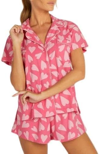 Women's 2 Pieces Heart/Plaid Print Sleepwear Short Sleeve Lapel T-Shirt + Elastic Waist Shorts Loungewear
