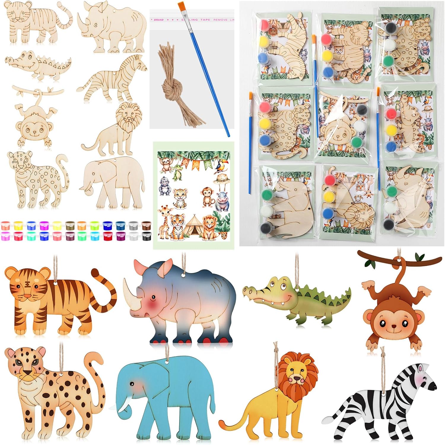 - Safari Craft Kit: packed with 24 wooden animal cutouts, including an elephant, lion, rhino, and more, 24 safari theme cards, 24 mini watercolor paints, 24 brushes, and 24 bags, this safari craft kit offers an platform to showcase their creativity