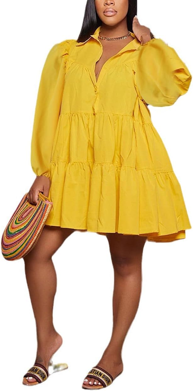 WOKANSE Women's 2024 Fall Cute Babydoll Ruffle Hem Puff Sleeve Dress Loose Plus Size Shirt Dresses