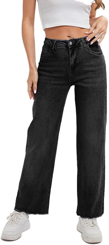 Women's Wide Leg Jeans 90S Vintage Zipper Fly Raw Hem Loose Fit Mid Rise Straight Leg Jeans for Women Denim Pants