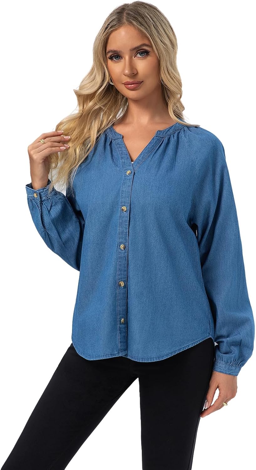 FASHIONSPARK Women's V-Neck Denim Shirt, Long Sleeve Puff Sleeve Top, Casual Blouse for Work, Travel, and Daily Wear