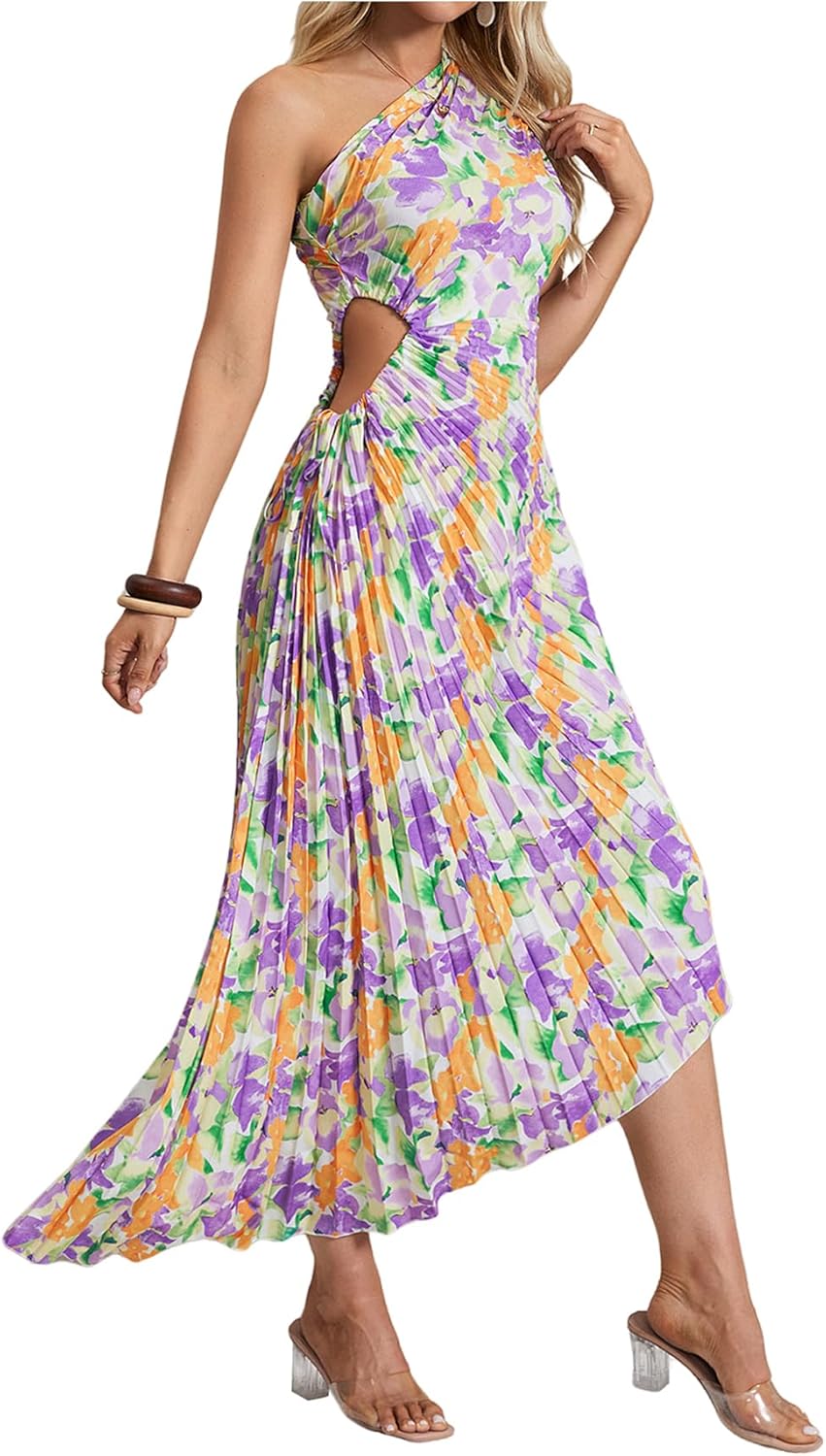 MakeMeChic Women's Casual Striped Cut Out One Shoulder Sleeveless High Waist Summer A Line Maxi Dresses