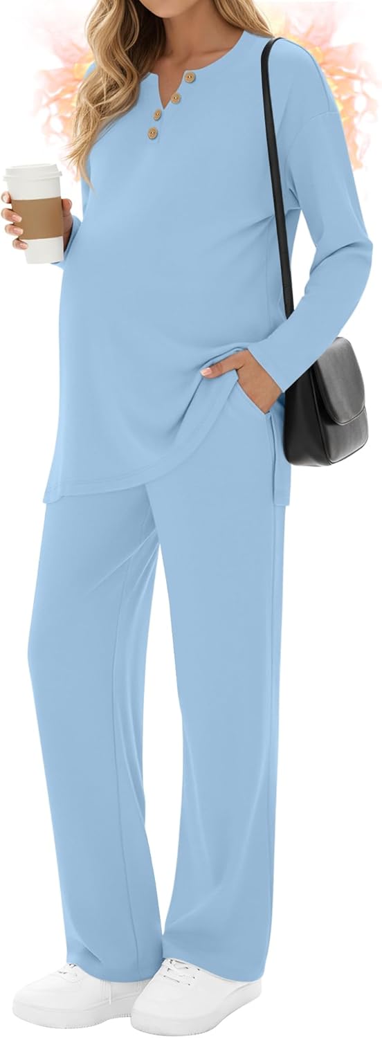 2 Piece Thermal Maternity Lounge Set Postpartum Pregnancy Fleece Loungewear Long Sleeve Top and Wide Leg Pant