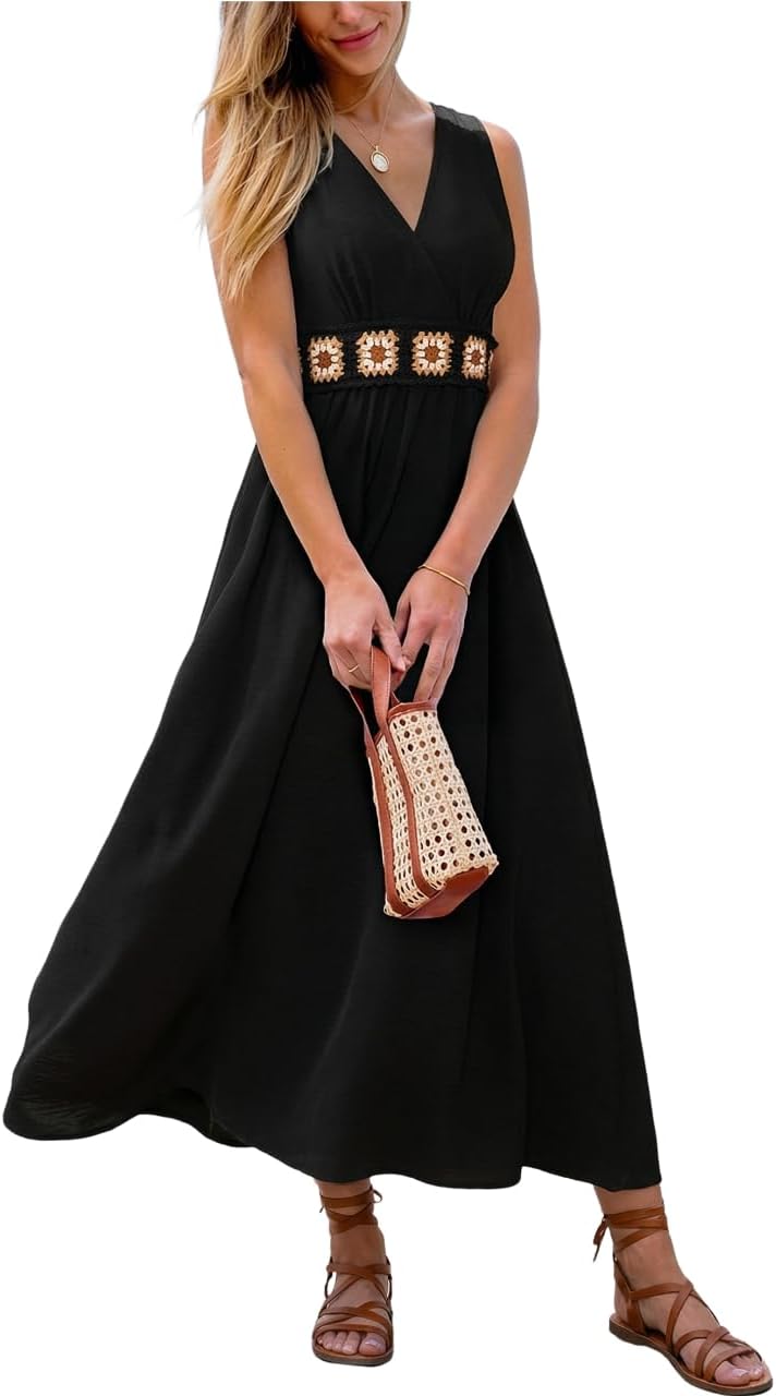 CUPSHE Women's Summer Dresses V Neck Bohemian Sleeveless Embroidered Waist Smocked Maxi Dress