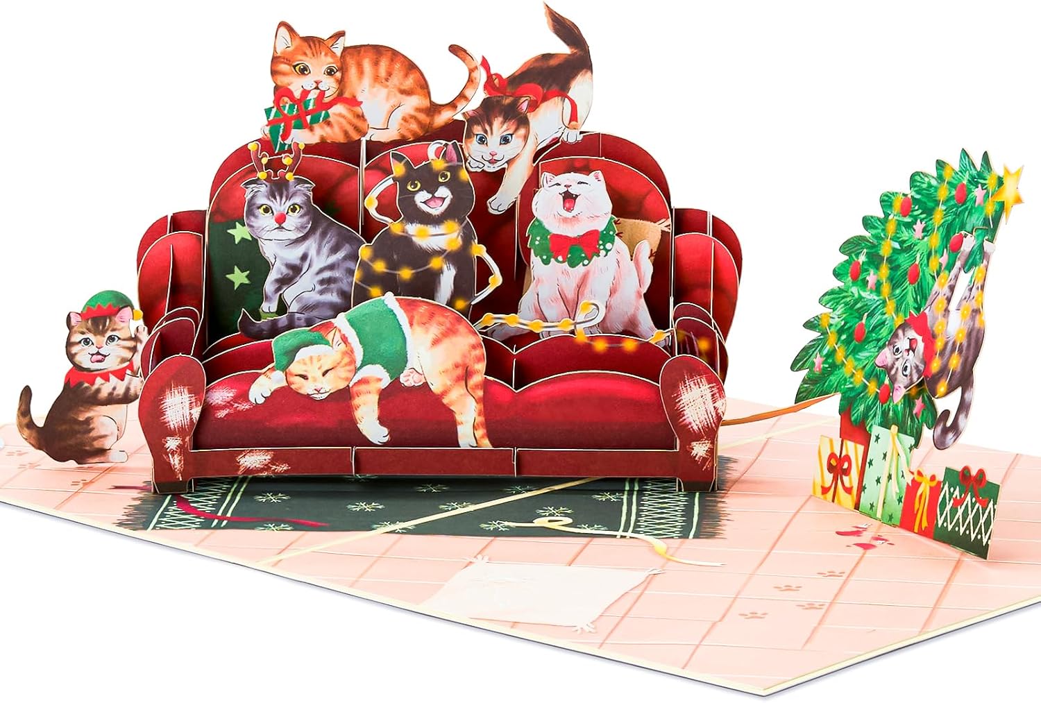 Christmas Sofa Cats Pop Up Card, Meowy Christmas, Xmas Tree, 3D Greeting Card, Gift for Cat Person, Kid, Boy, Girl, Sister, Brother, 5x7 - Includes Envelope And Message Note