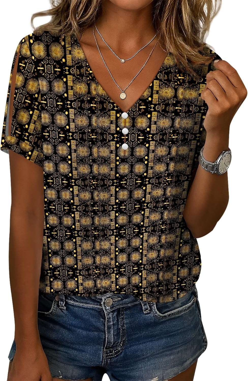 Boho Blouse for Women Cold Shoulder Short Sleeve Tops Cute V Neck Button Down Shirts Summer Casual Fit Tunic Shirts