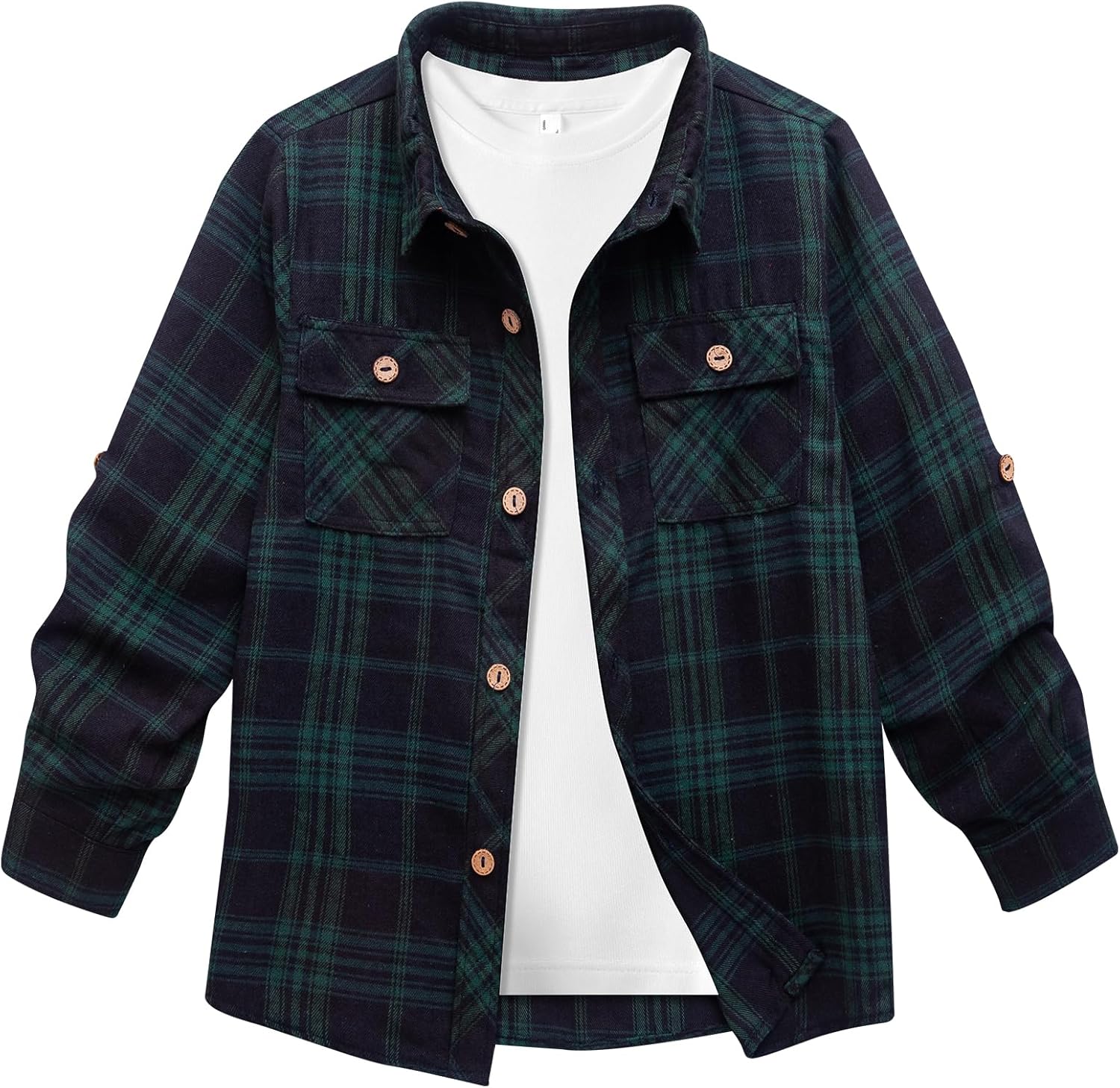 Boys Plaid Flannel Shirts Long Sleeve Casual Button Down Shirts Collared Fall Clothes Navy Green 10-11 Years