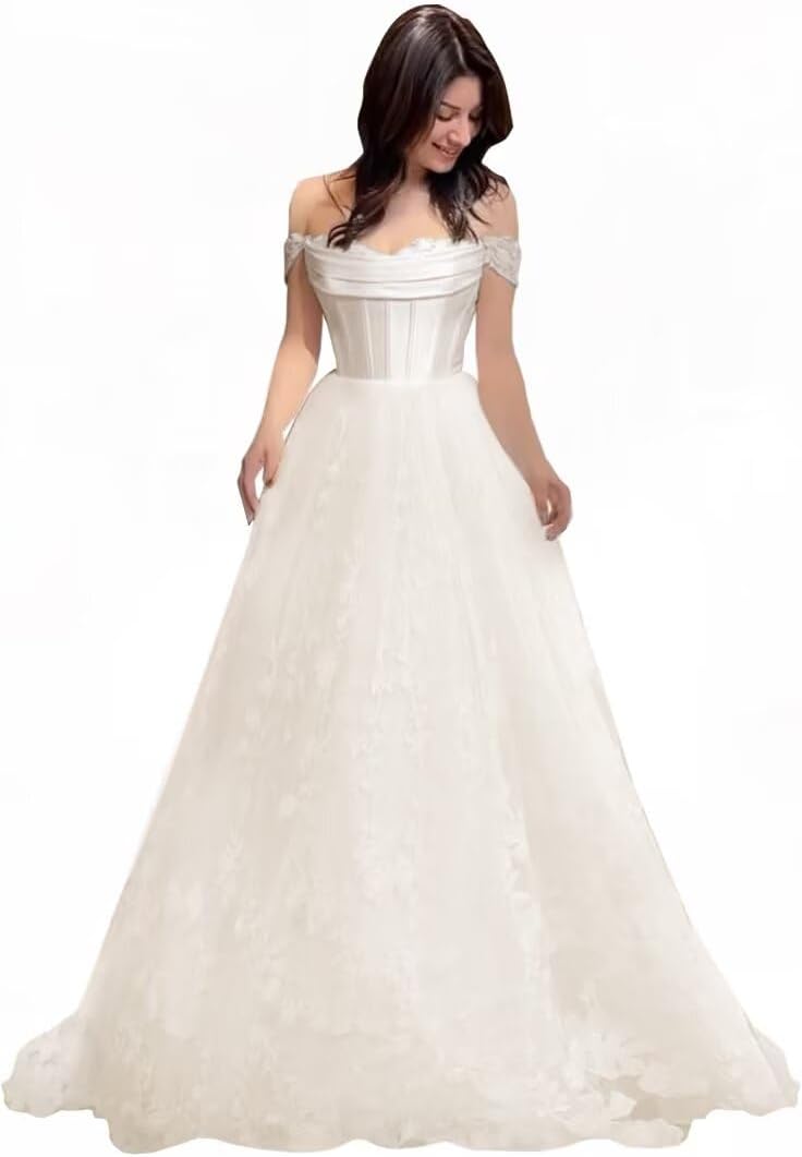 Off Shoulder Lace Applique Wedding Dress for Bride Strapless A-Line Satin Pleated Tulle Bridal Ball Gown with Corset