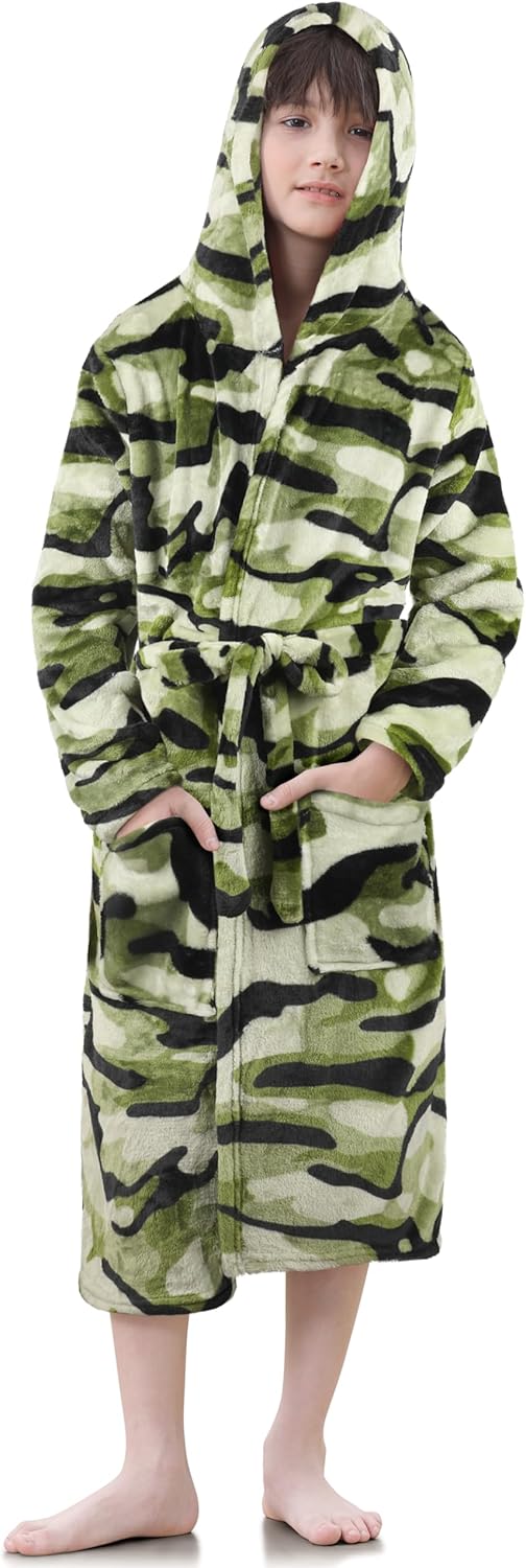 IHU Boys Fleece Robe, Kids Hooded Soft Fuzzy Robes Bathrobe Toddler Flannel Pajamas Sleepwear Spa Plush Robe for Boys Girls