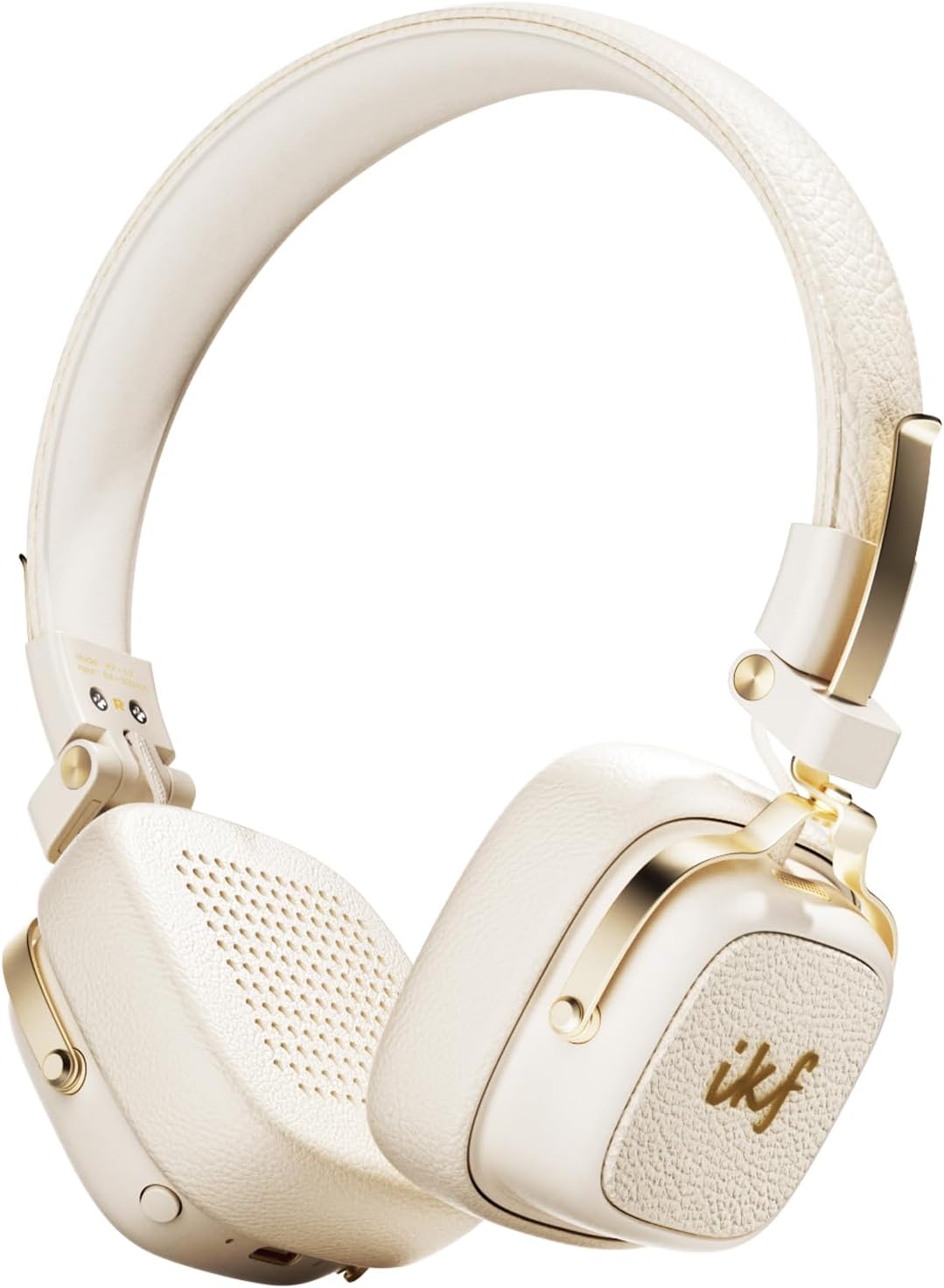 iKF E2 Bluetooth On-Ear Headphones, Wireless Foldable Headset with 90H Playtime, 40mm Drivers, Deep Bass, 3D Spatial Sound, Built-in Mic (Offwhite)