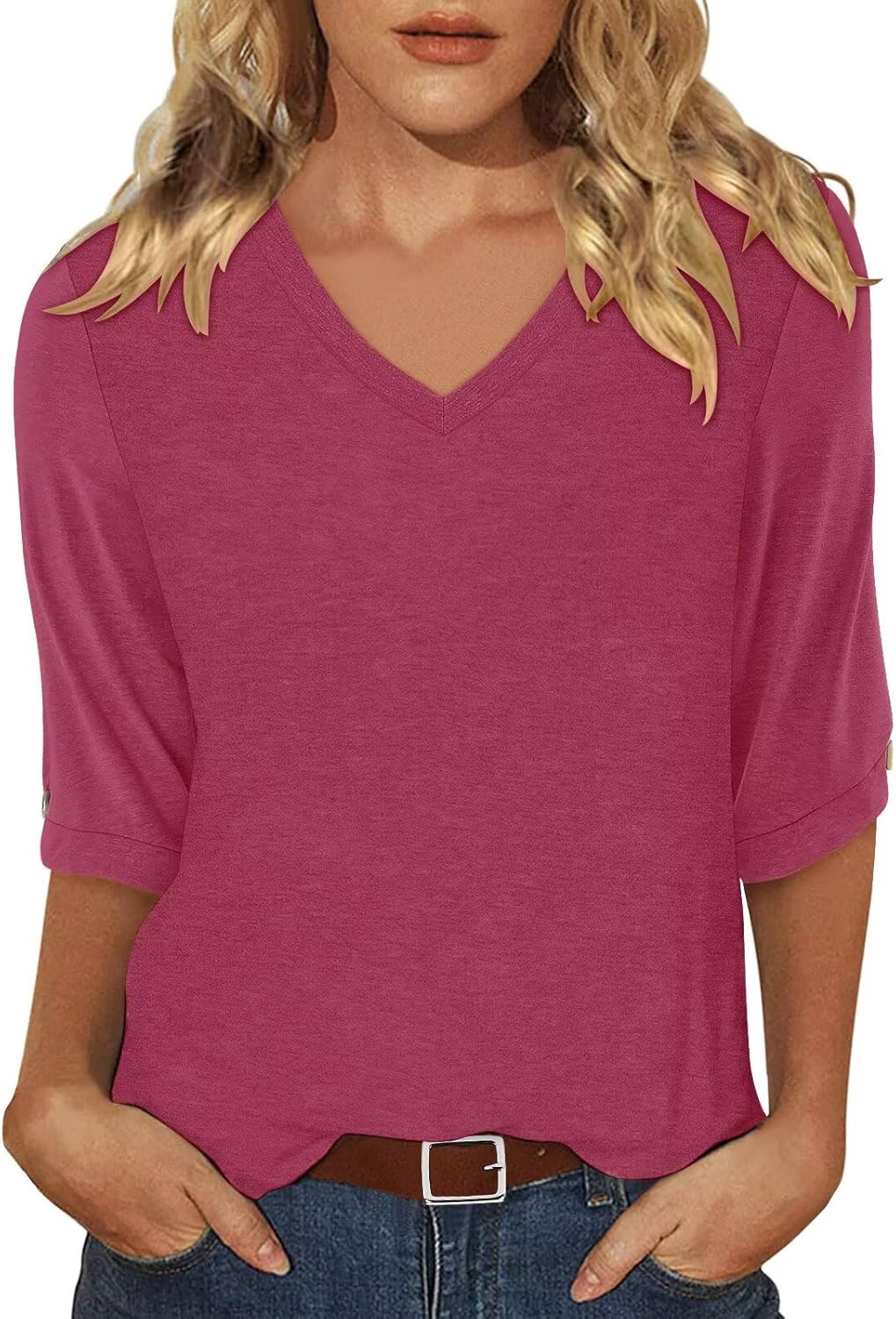 KISSMODA Women's Casual 3/4 Sleeve T-Shirts 2025 V-Neck Tunic Tops Cute Tees Blouses Loose Fit Business Work Tee Top