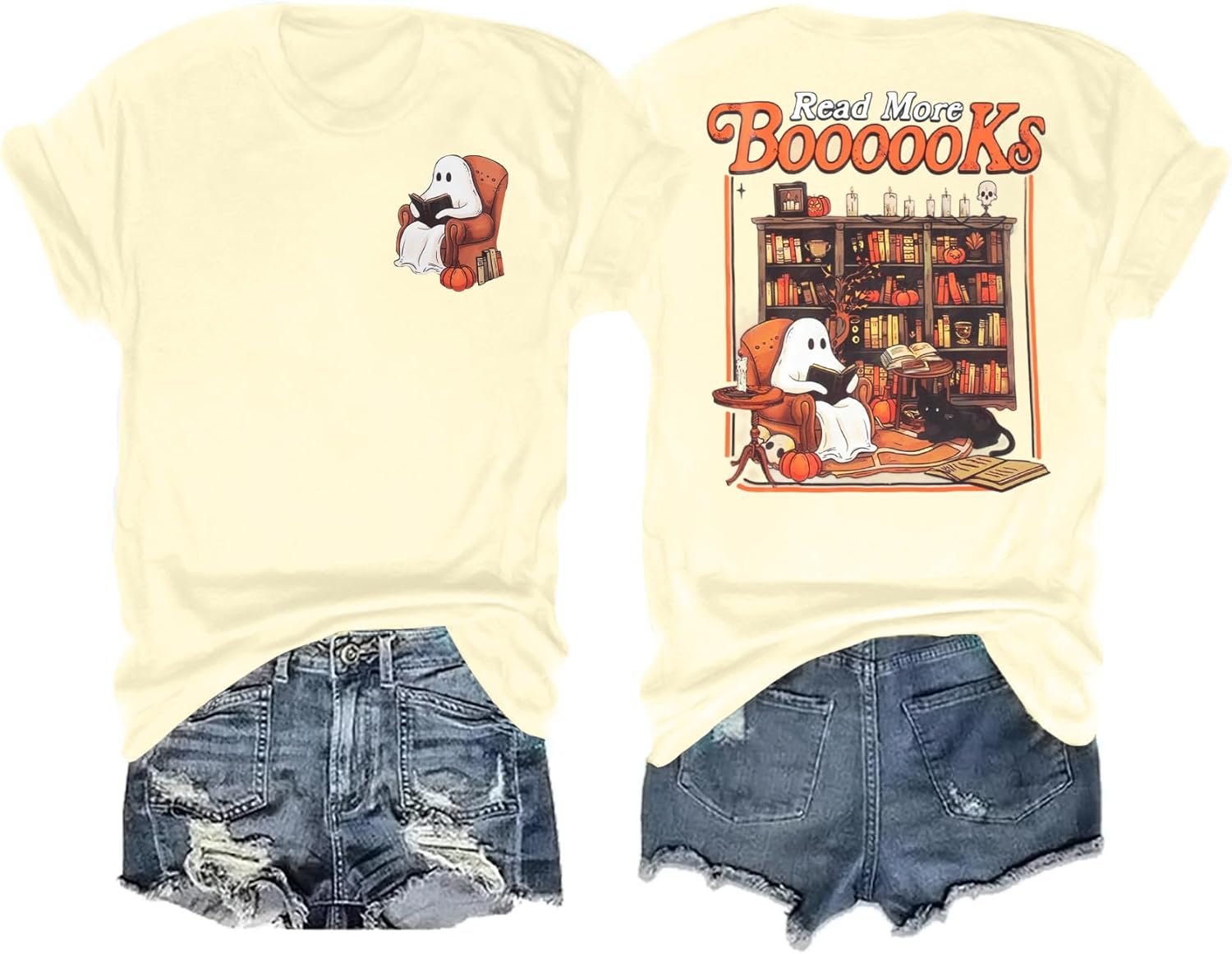 Halloween Teacher Shirts Women Spooky Teachers T-Shirt Cute Ghost Pumpkin Graphic T Shirt Teach My Boo Reading Tops