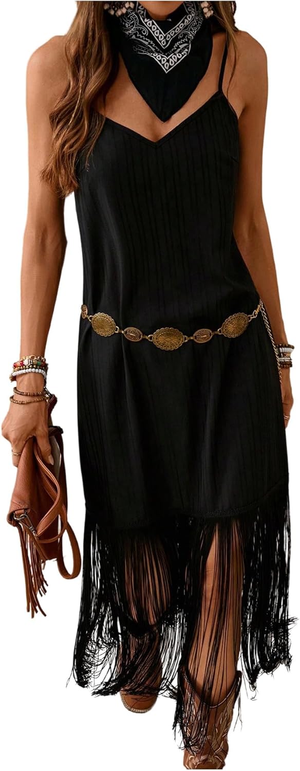 Verdusa Women's Western Fringe Dress Vintage Deep V Neck Maxi Cowgirl Dresses