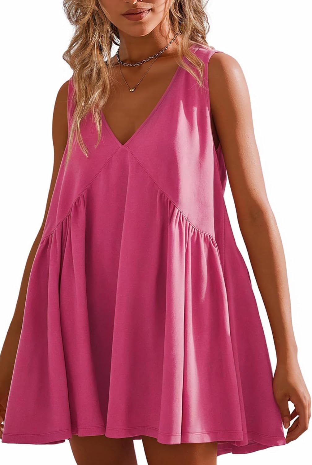 Womens Summer Sleeveless Mini Dress Casual V Neck Loose Pleated Sundress with Pockets