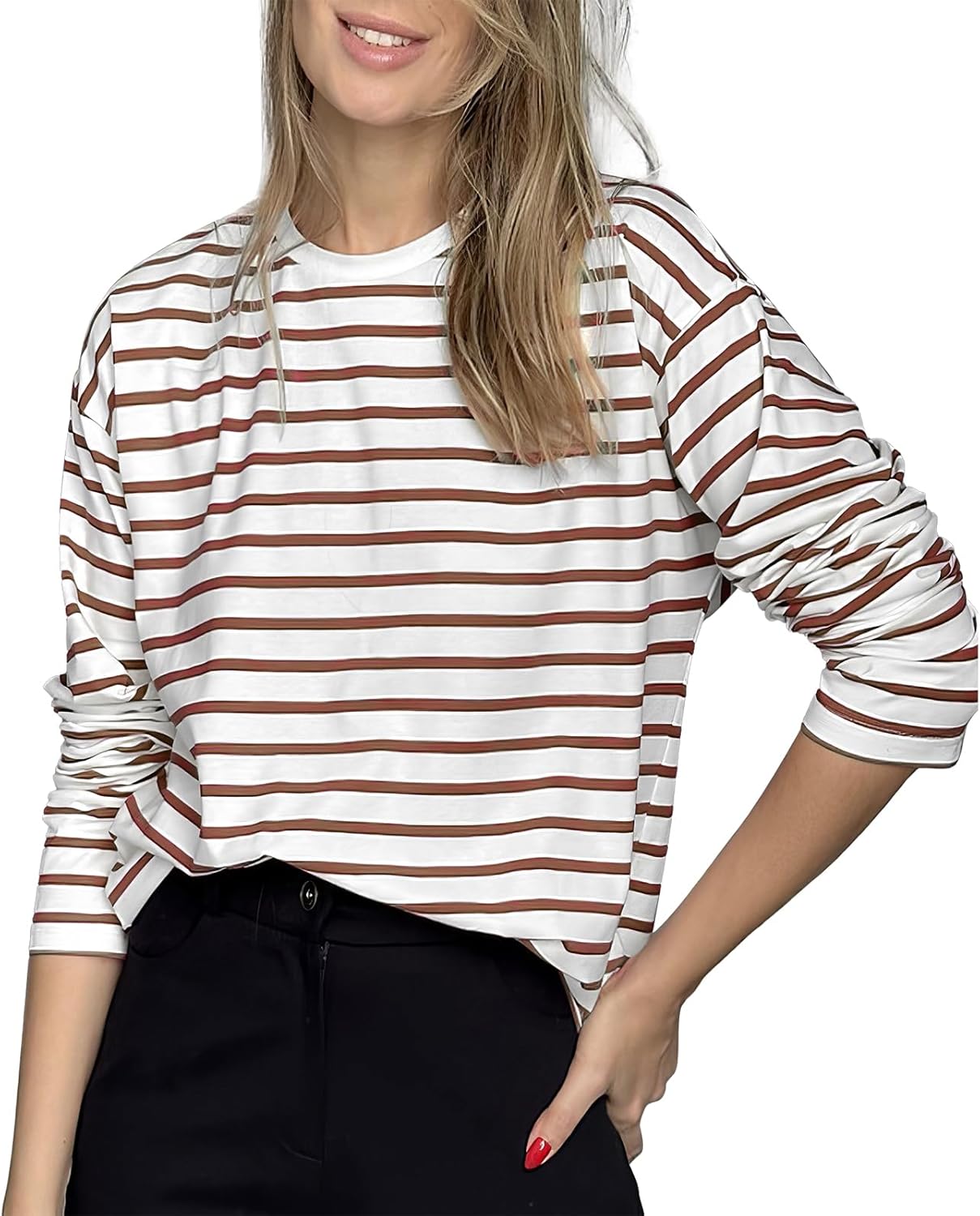 Women's Striped Long Sleeve T-Shirt - Crewneck Relaxed Fit ClassicTee with Stretch, Casual Breton Top