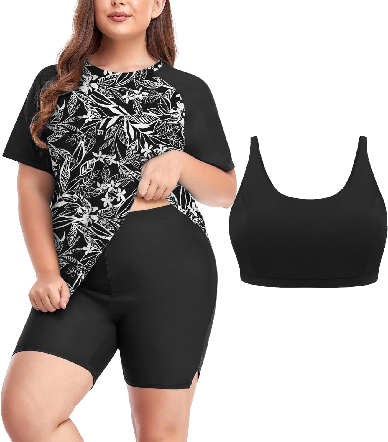 Inno Women's Plus Size 3 Piece Rash Guard Set with Bra Swimsuits Short Sleeve with Boyshorts UPF 50+ Surfing Swimwear, Black White with Bra,3X