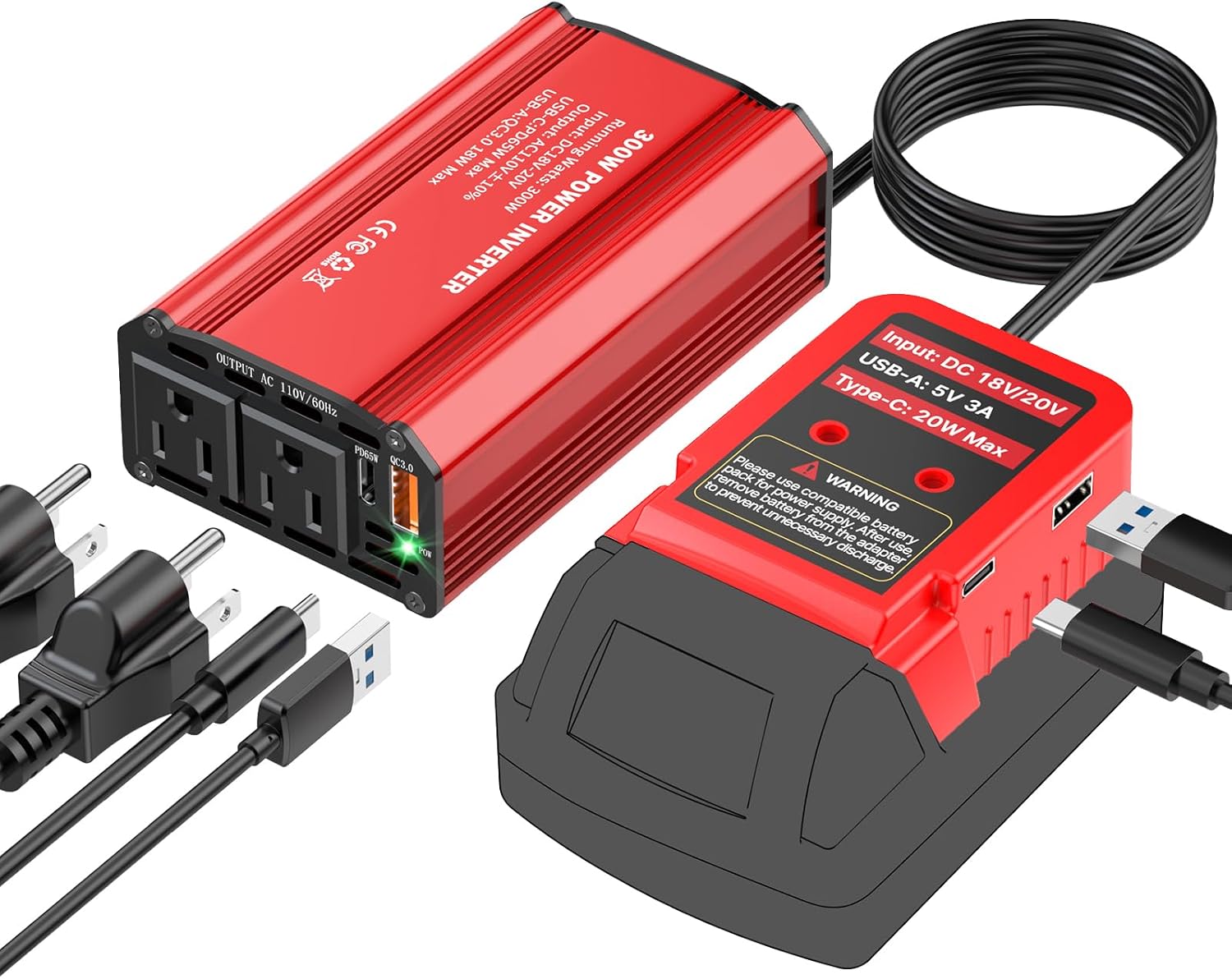 300W Power Inverter Compatible with Milwaukee M18 Battery, DC 18V to AC 110V Portable Power Station Generator with 2 AC Outlets & 1 Type-C PD 65W &1 Type-C PD 20W & 2 USB A 18W Max for Emergency Power