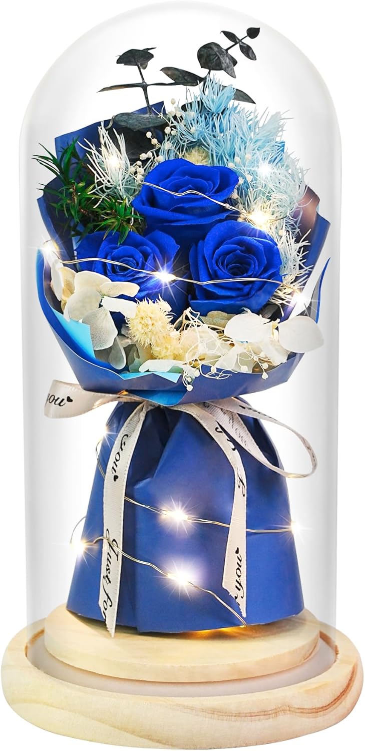 HVY Preserved Real Flowers Bouquet Gifts for Her,Forever Flowers Gift for Women,Preserved Blue Rose in Glass Dome with LED Light Ideal for Christmas,Birthday,Anniversary,Valentine's Day, Mother's Day