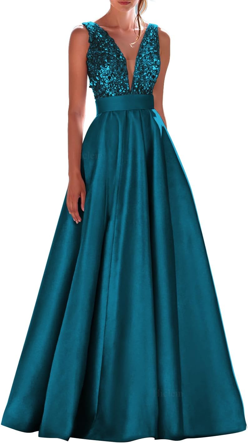 V Neck Satin Prom Dresses for Women 2026 Sequin Formal Dress A Line Backless Wedding Evening Gown with Pockets