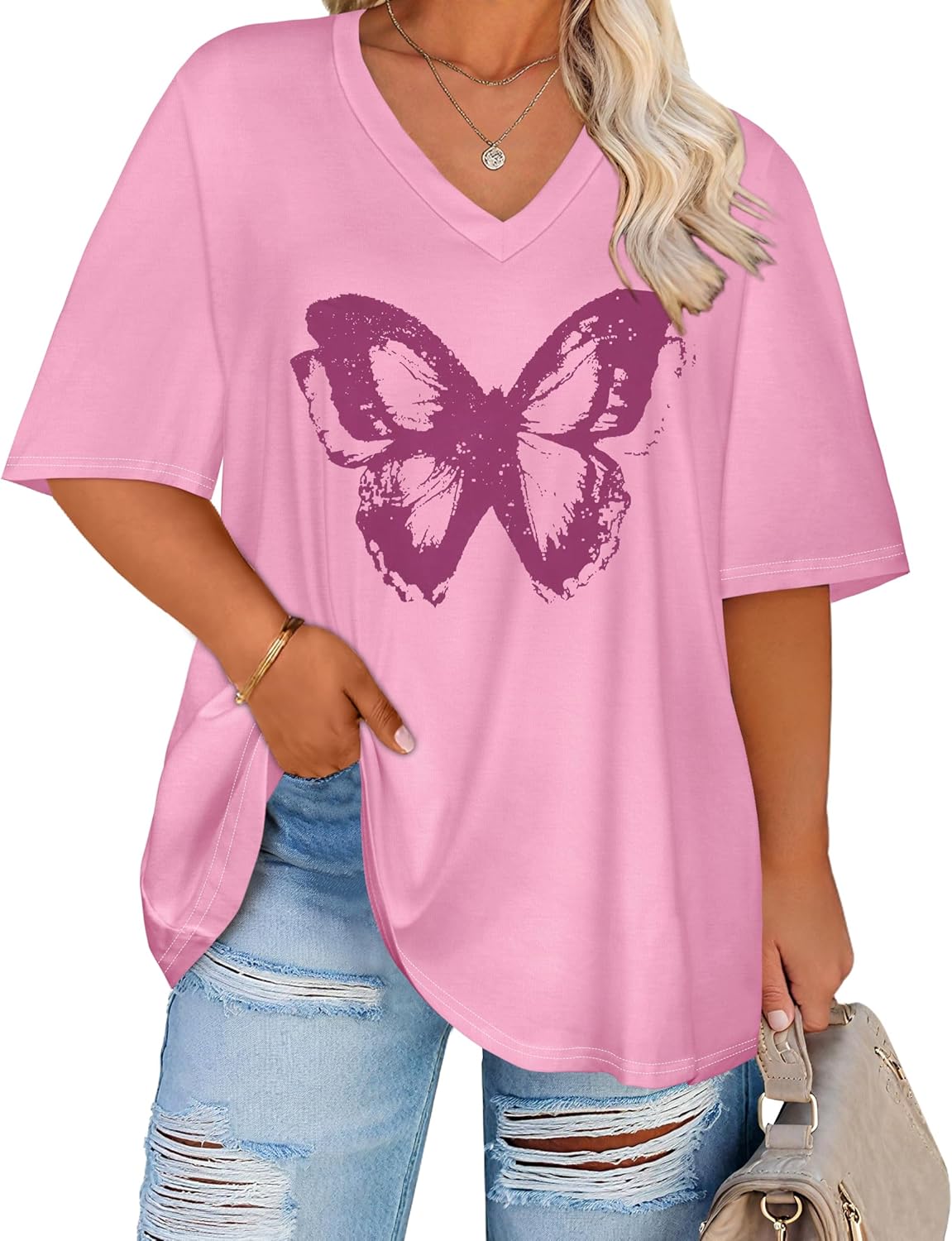 rosemia Plus Size Tops for Women Oversized Casual Tops V Neck Short Sleeves Basic Tees